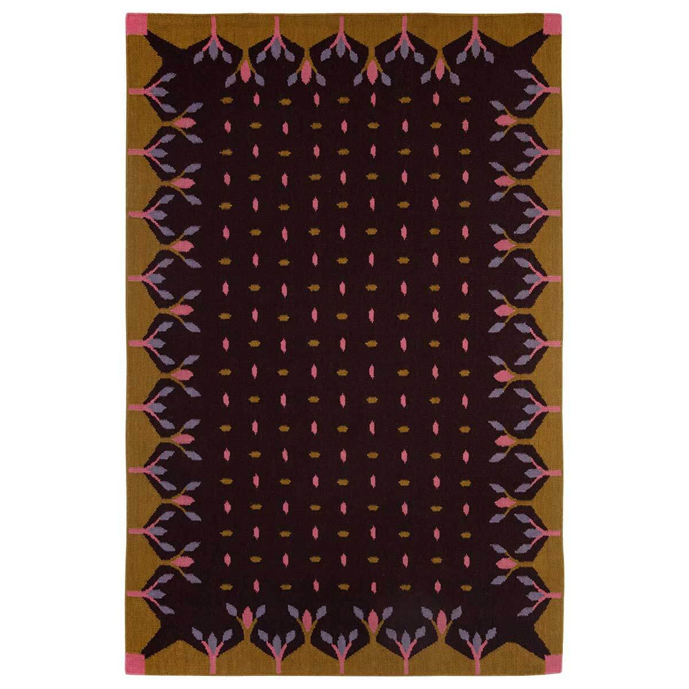 A rich dark brown with reddish purple undertones and mustard yellow border, the design of this flatweave rug is inspired by prickly gorse hedgerows.