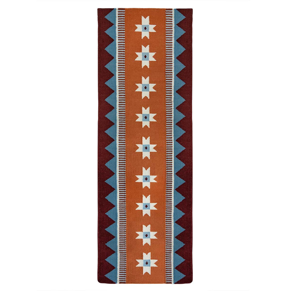 A modern interpretation of traditional Victorian tile designs, this colourful flatweave runner is handwoven in a striking combination of orange, claret and blue.
