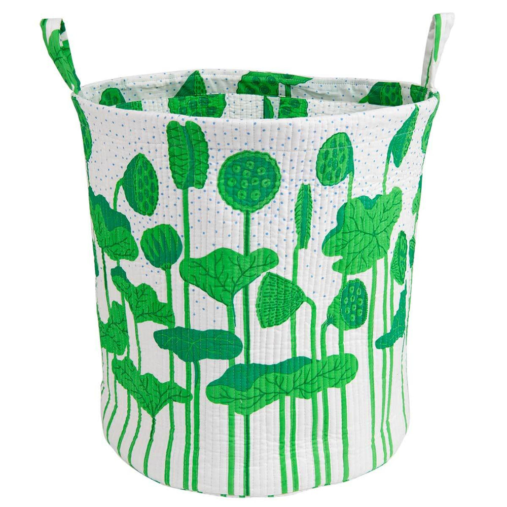 Hand screen printed with a leafy botanical print in uplifting shades of green, the Lotus Stem storage basket will bring a touch nature to your home, whilst helping you keep things off the floor and organised in the living room, bedroom, playroom or nursery.