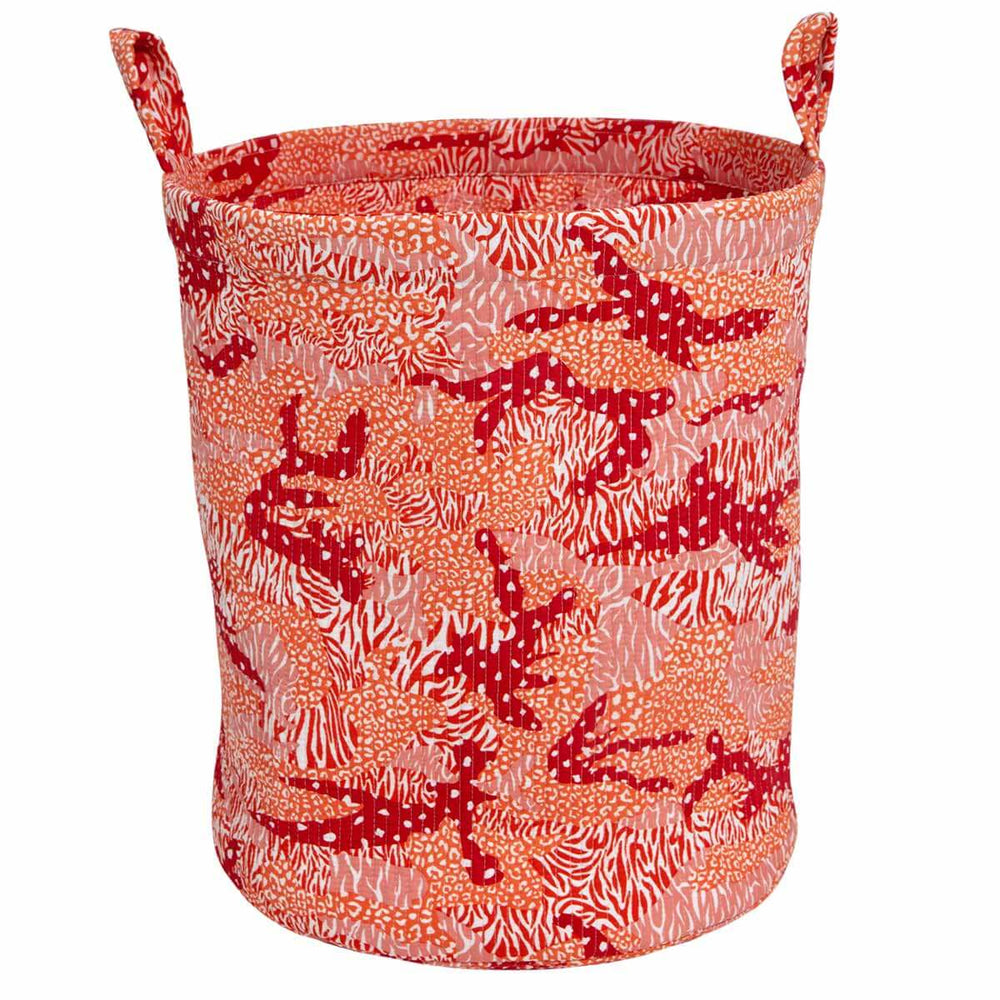 Featuring a playful mix of bright orange and red animal and camouflage prints, this eye-catching basket is both fun and functional.