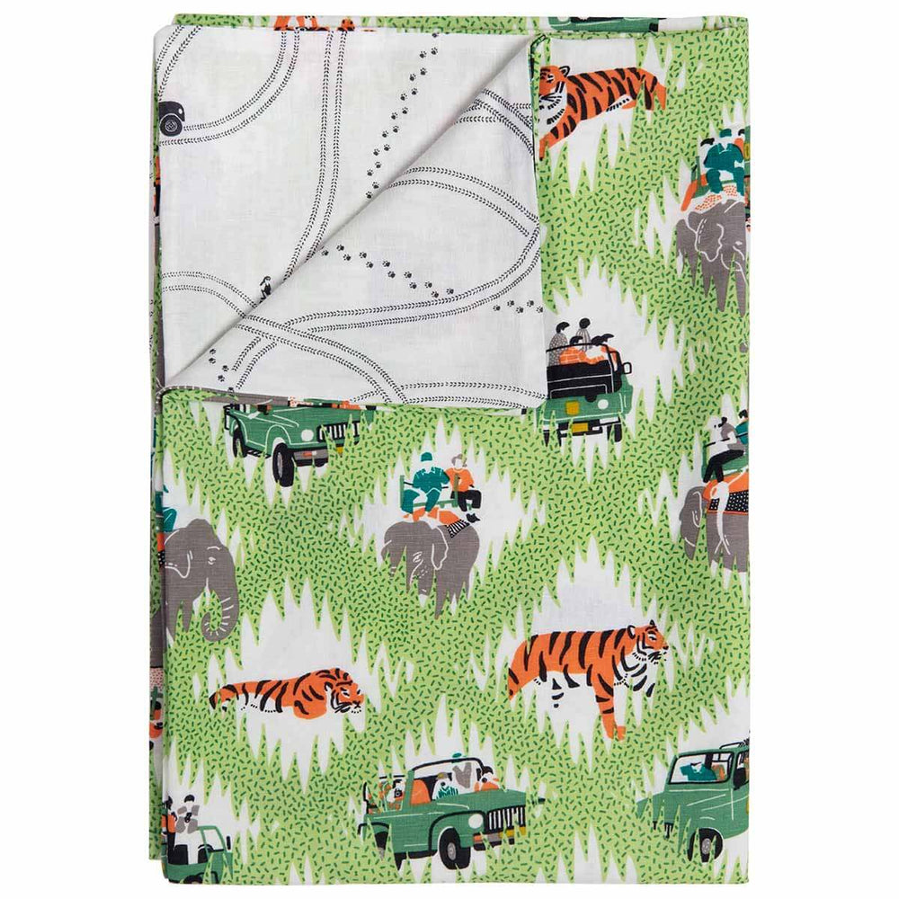 Perfect for kids that love animals and adventure, the Tiger Safari duvet cover and pillowcase set is made from quality cotton linen that gets softer with every wash. Hand screen printed with tigers, elephants and jeeps one side and a looping print of pug marks and jeep tracks on the other, it is reversible to give two looks in one!
