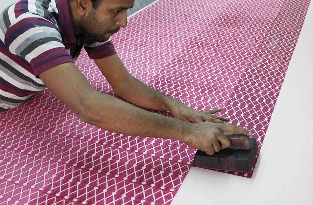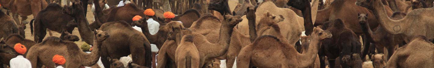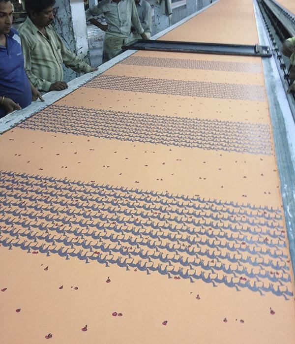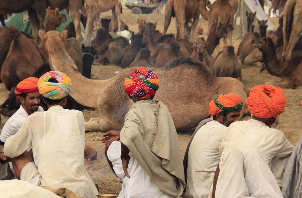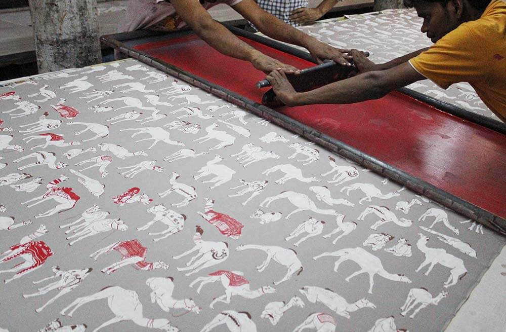 Our Camel Traders print is inspired by the scene of snappily dressed traders standing out amongst the herd of camels in their traditional Rajasthani dress of white kurtas and bright turbans.