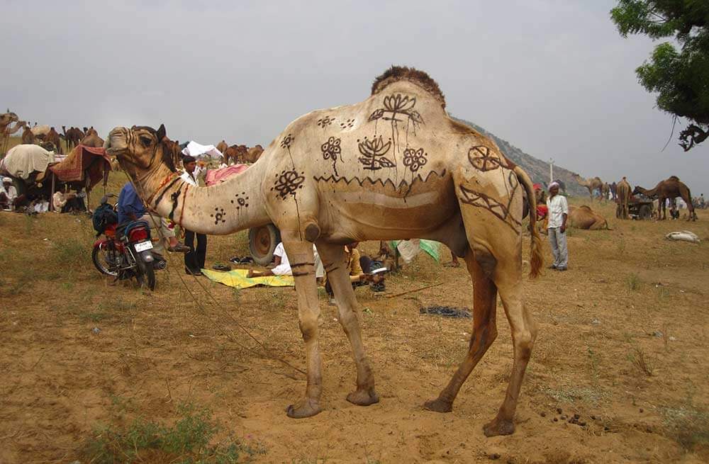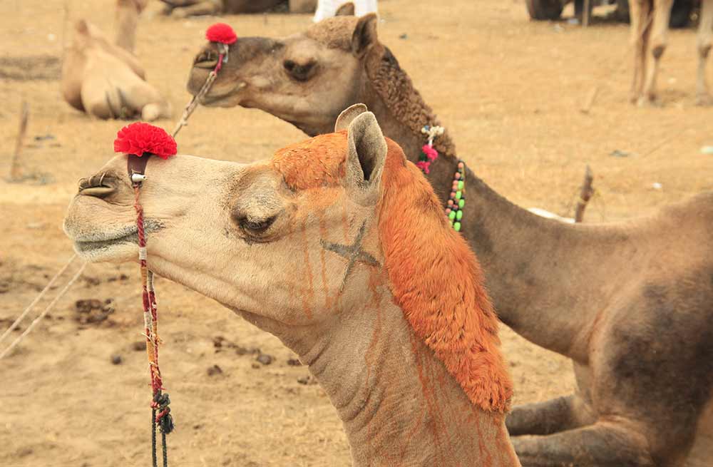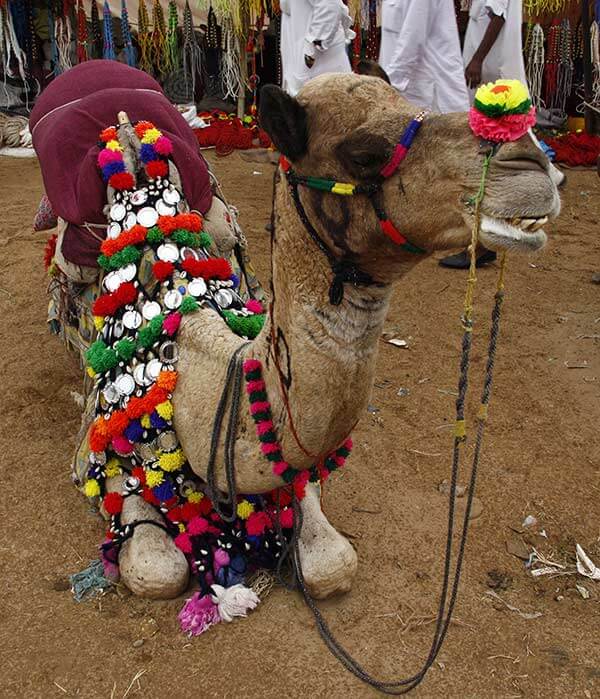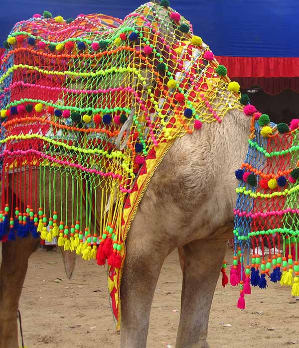 From afar they all look the same, but get up close and you’ll see each camel has it’s own style, from dyed or plaited hair to painted motifs, plastic flowers, beads, nose rings and appliquéd coats, as illustrated in our Different Camel Print.