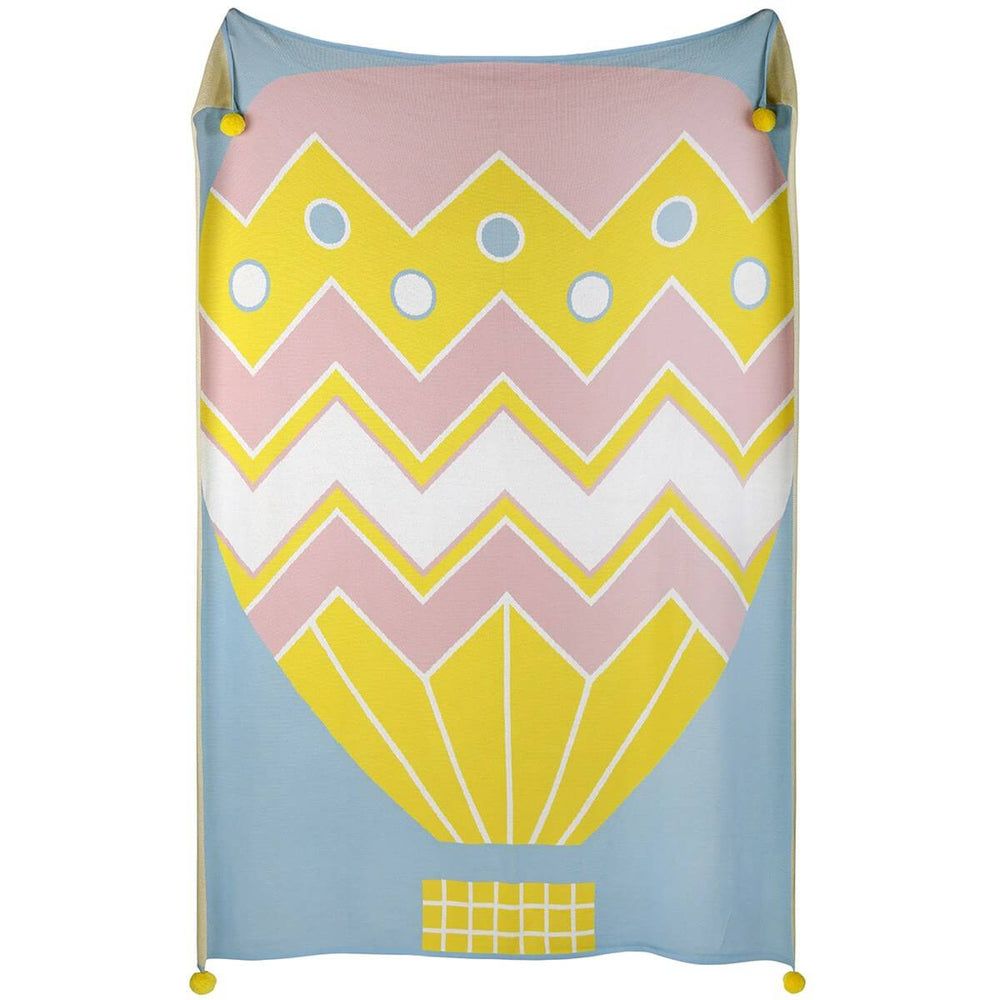 A cosy and uplifting blanket, knitted with a giant hot air balloon design.