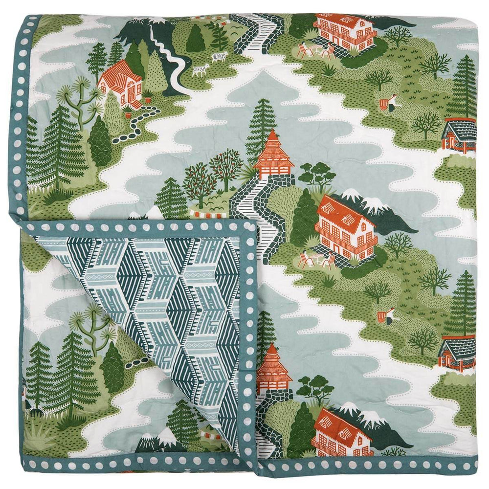 Wonderfully unique, the Mountain Zig Zag quilt is illustrated with a landscape scene capturing memories of our travels in the foothills of the Himalayas. Reversible, the other side features the geometric ‘Kullu House’ pattern, hand screen printed in shades of blue.