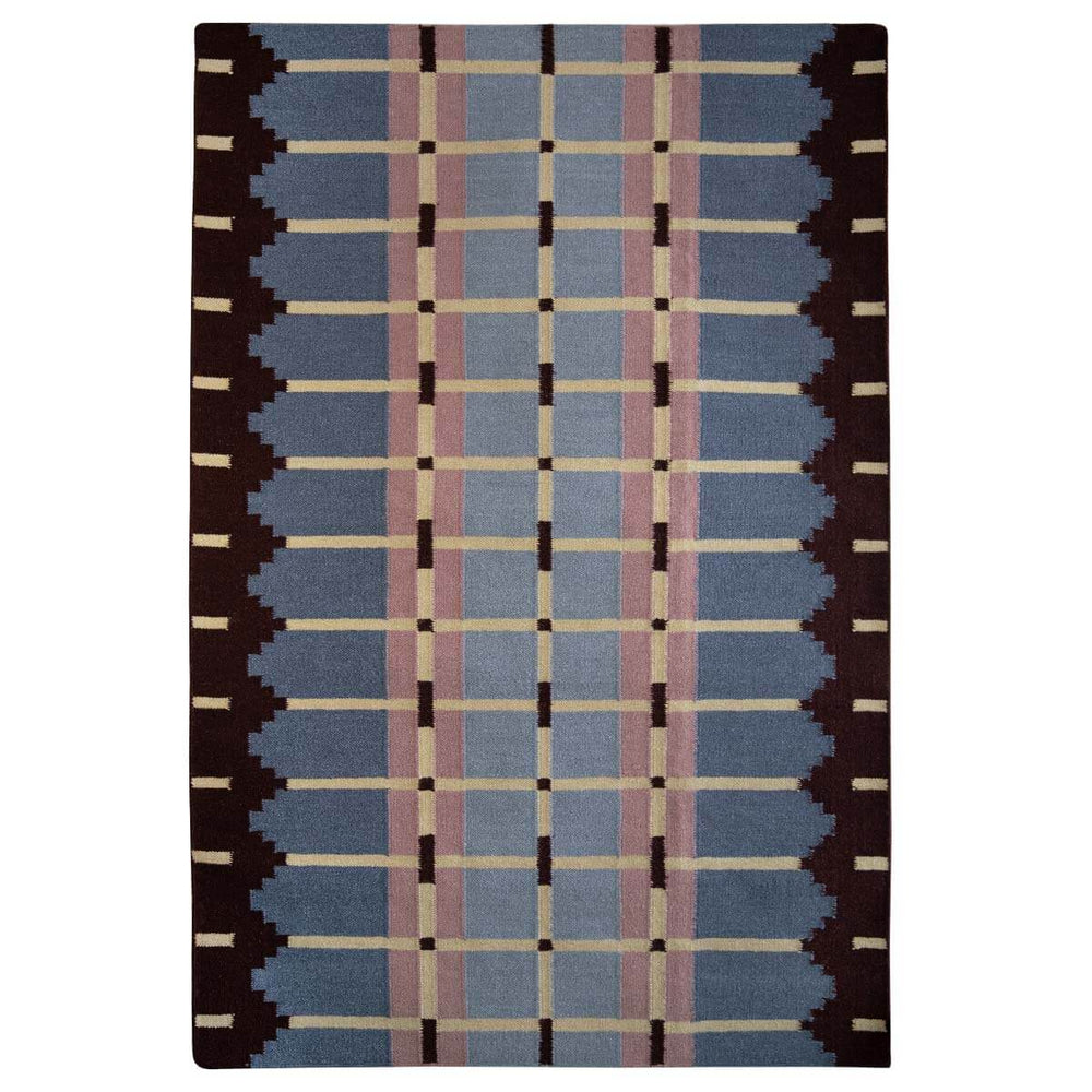A dusky blue flatweave rug, handwoven with an architectural grid pattern.