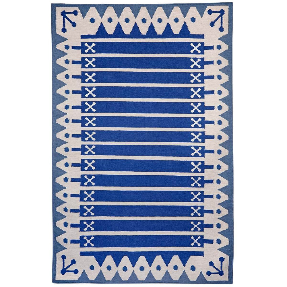 With its striking wide stripes and triangle border, this wool rug features three tones of blue on an ecru and oatmeal abrash base, bringing colour and interest to any interior.