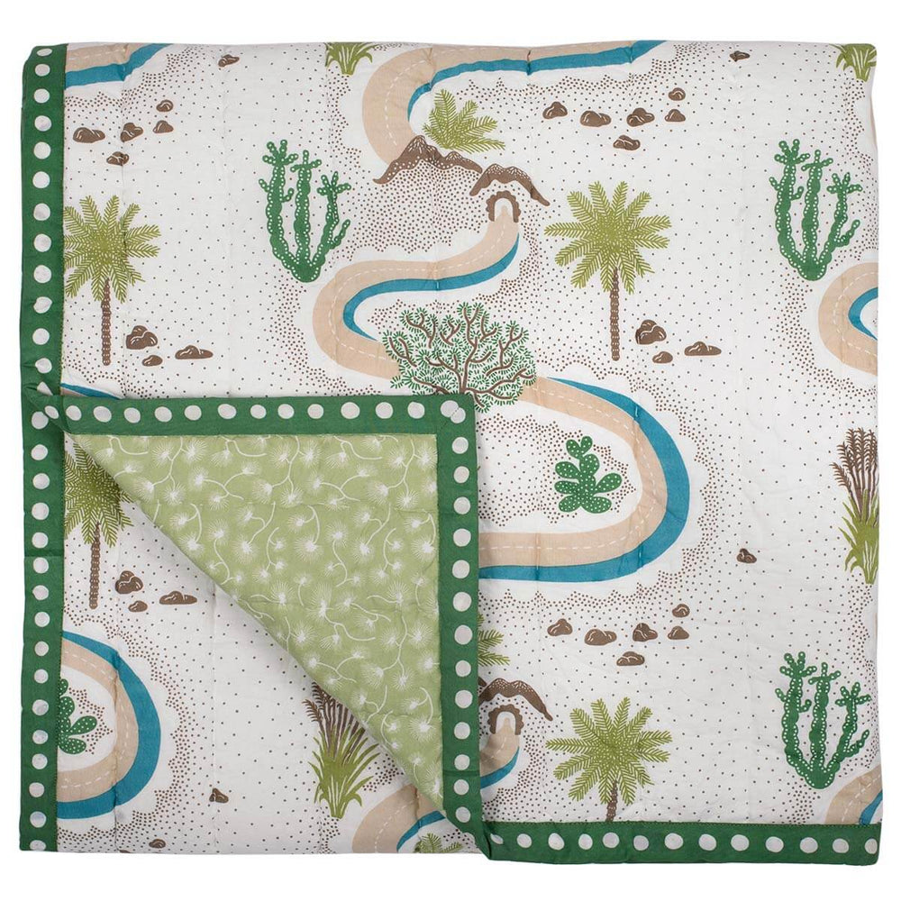 The Winding Roads Baby Quilt evokes a peaceful journey through the foothills of the Himalayas, hand screen printed with gently winding roads and rivers, framed by pampas grass, cacti, and palm trees in a soothing palette of greens, blues, and soft taupe brown.