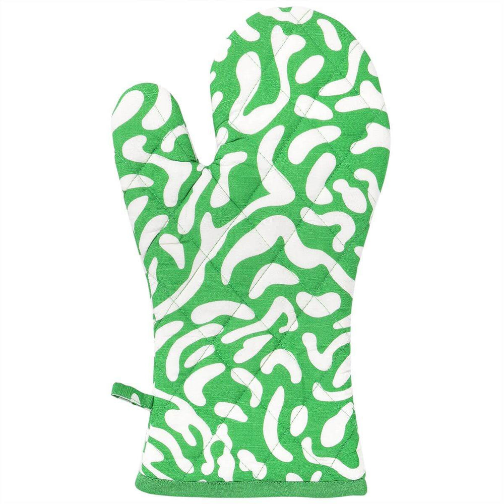 Add a bright pop of green to your kitchen with this cotton linen oven glove hand screen printed with an abstract Golf course inspired print.