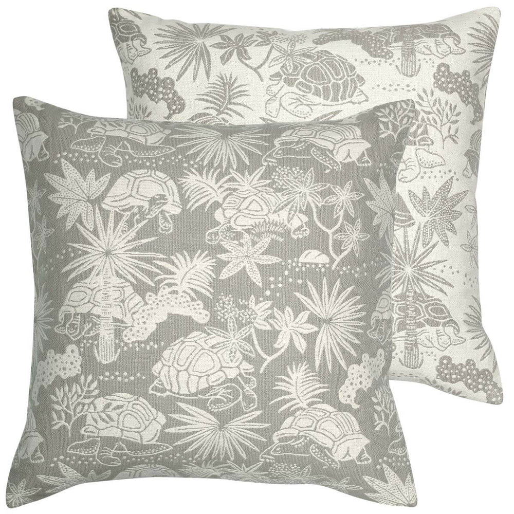 This greige patterned cushion cover is woven with giant tortoises and foliage, inspired by the nature reserves of Mauritius. With its natural tones of ecru and greige (a greyish beige) this cushion has a lovely textural quality making it a great choice for adding interest and subtle pattern to neutral interiors.