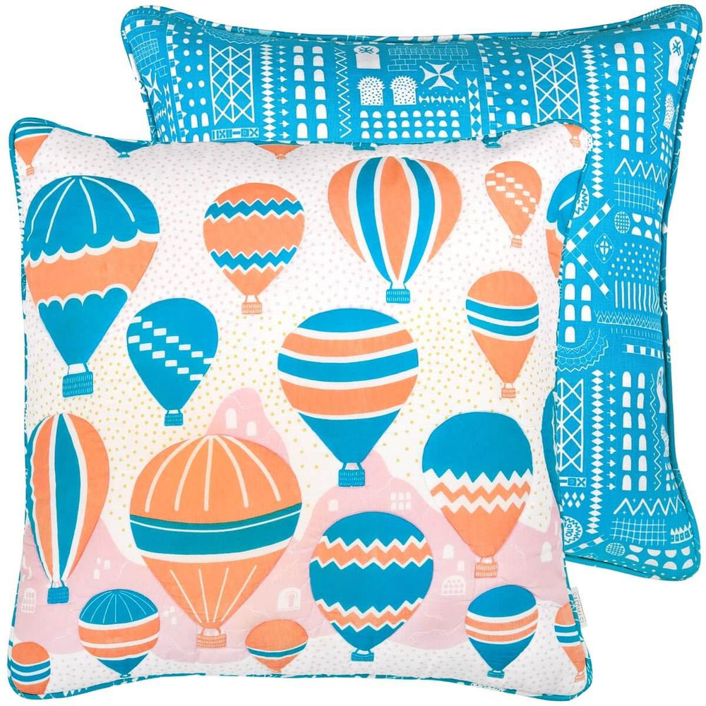 This gorgeous quilted cushion cover is as soft as clouds! Inspired by our travels in Cappadocia, Turkey – a hot spot for ballooning, where every day at dawn hundreds of hot air balloons float into the sky. Reversible, the other side features a bright blue print on cotton linen, inspired by painted symbols and rock-cut windows and doors on cave houses and churches in the region.