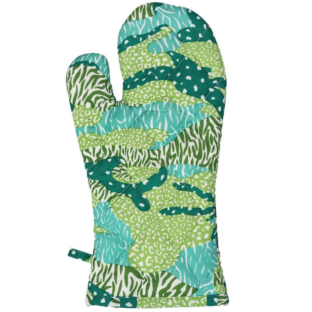 Brighten up the kitchen with this oven glove handprinted with a medley of camouflage and animal print in vivid shades of green.