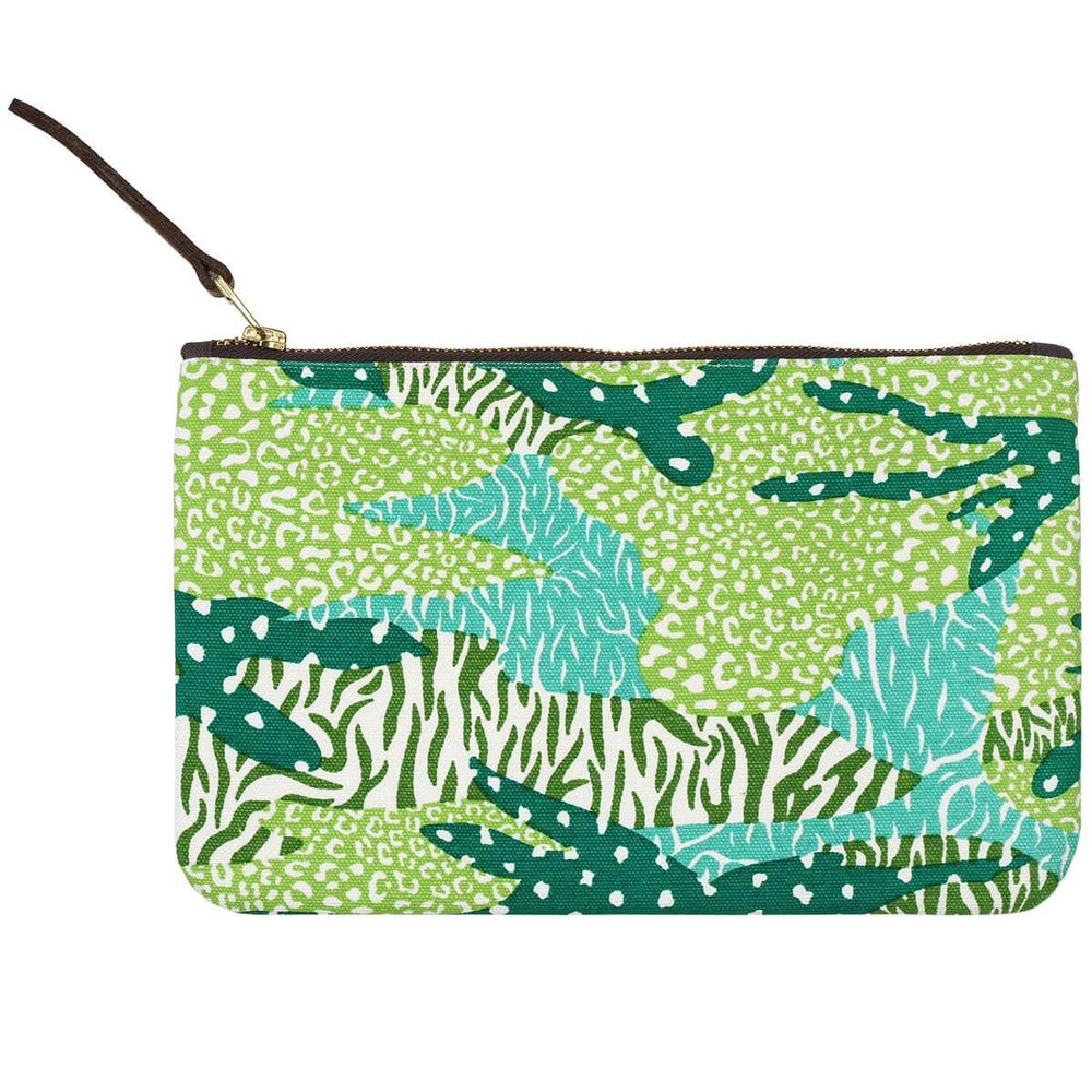 Accessorise with this super cool patterned clutch pouch. A quirky combination of animal print and camouflage handprinted in lush shades of green, it will hold all your essential bits and pieces.