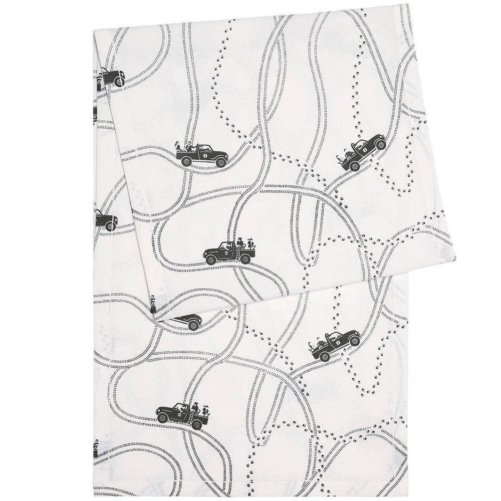 Monochrome handprinted table runner constructed from high quality cotton linen. The fluid curves in the pattern illustrate jeep tracks and tiger trails as they explore the forests of central India.