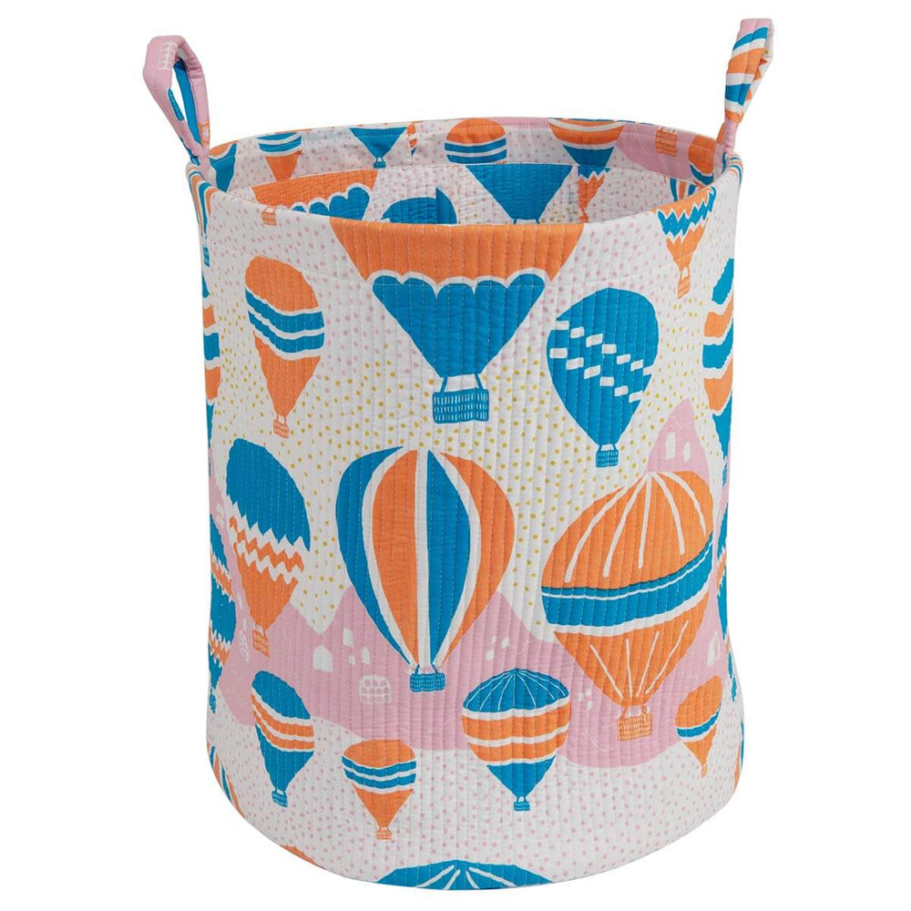 Hand screen printed with a hot air balloon landscape scene, this quilted storage basket is perfect for organizing anything from blankets and towels to children's toys and gym gear.