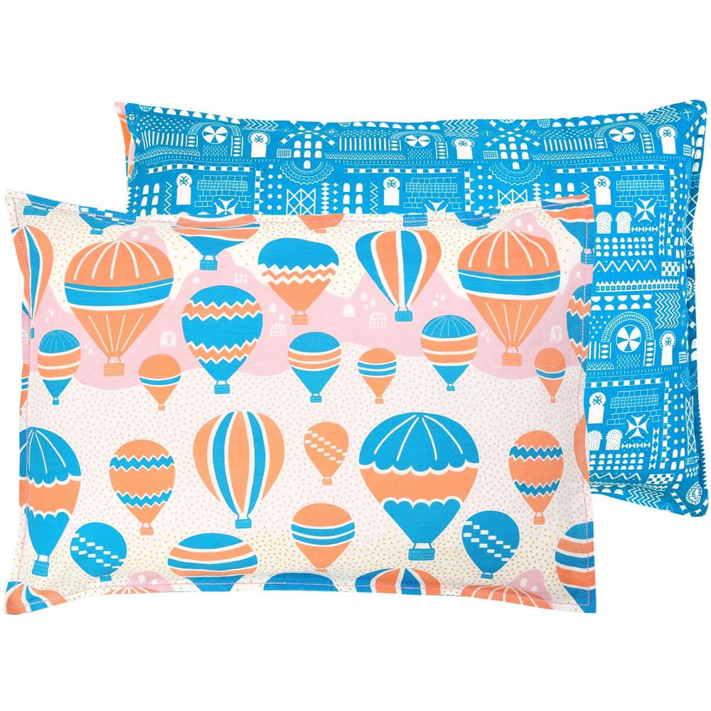 Dream of floating over fabulous landscapes with this pillowcase hand screenprinted with a hot air balloon print on one side, and geometric Blue Stone Symbol print on the other.