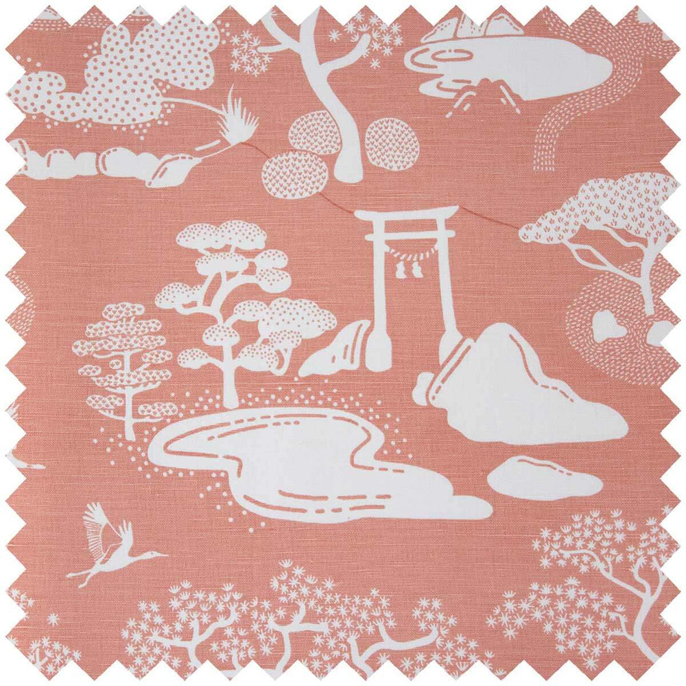 Hand screen printed with an illustrated landscape inspired inspired by Japanese gardens, this dusty pink cotton linen fabric is a versatile weight for many uses including soft furnishings, curtains, blinds and upholstery.