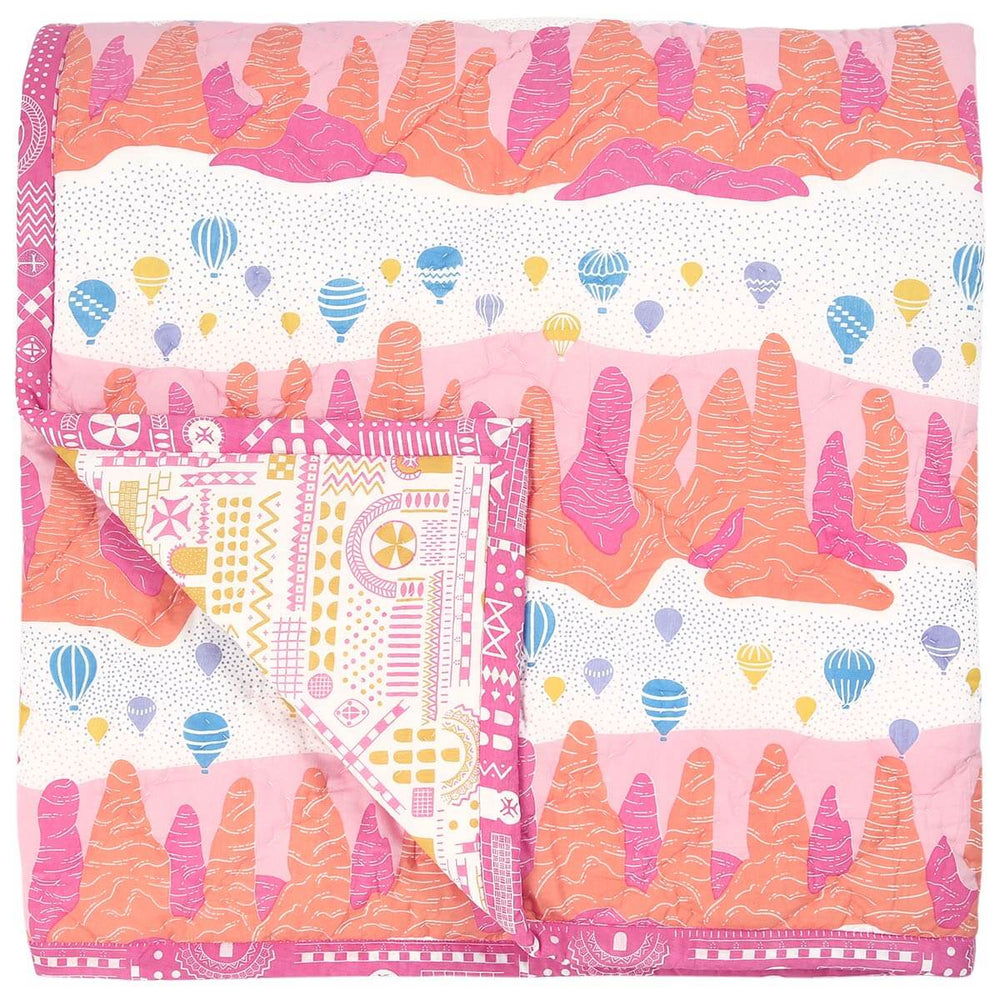 Make your bedroom a bright and happy place with this hand printed, hand quilted bedspread illustrating hot air balloons floating over fairy chimneys inspired by our travels in Cappadocia, Turkey. With a geometric pink and yellow pattern on the other side it will look fabulous whichever side you choose to use!