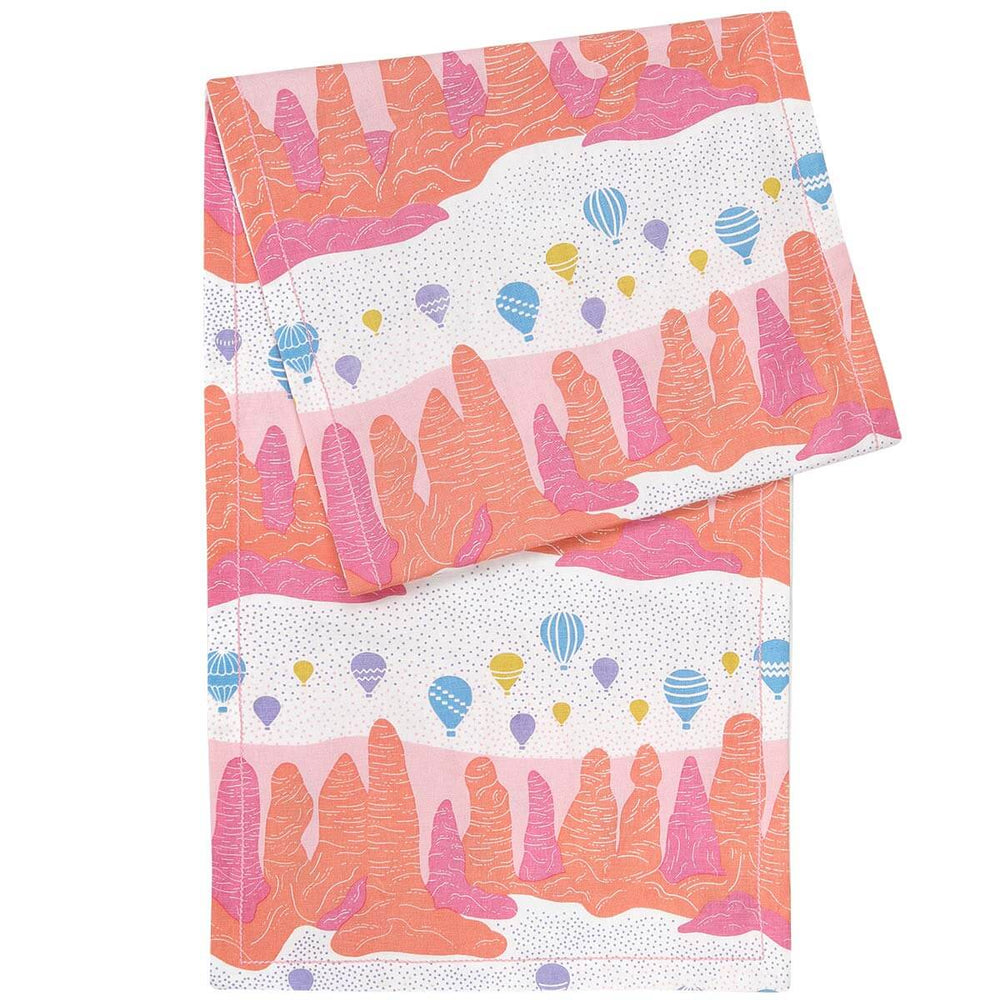 Cheer up your table with this colourful runner hand printed with a dreamy pattern of hot air balloons floating over fairy chimneys inspired by our travels in Cappadocia, Turkey.