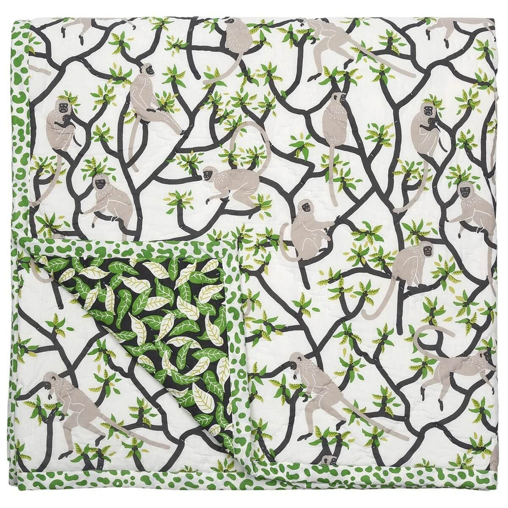 Hand printed with a playful pattern of Langur monkeys this soft cotton quilt has been quilted by hand. Reversible, the other side features a beautiful illustrated leaf print.