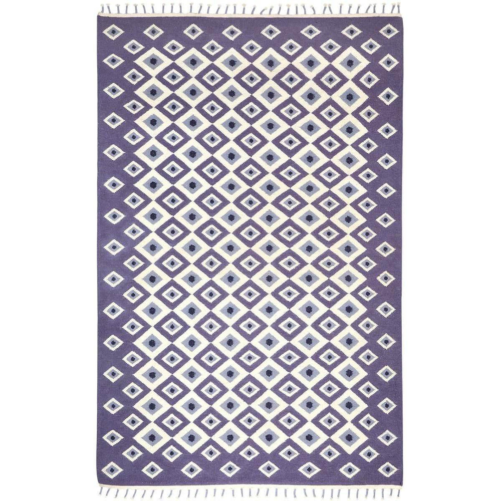 Handwoven in soft shades of purple, blue-grey and white the pattern on this versatile rug is inspired by Evil Eye motifs spotted on our travels in Turkey. After weaving the yarn is hand tied and wrapped, to make a fun tassel edge.