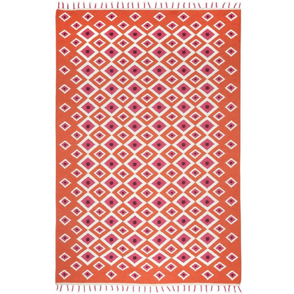 Instantly lift your room with this stunning pink and orange dhurrie, handwoven in wool in a captivating combination of colours. The geometric 'Evil Eye' design is inspired by travels in Turkey and will add interest, warmth and colour to your space.