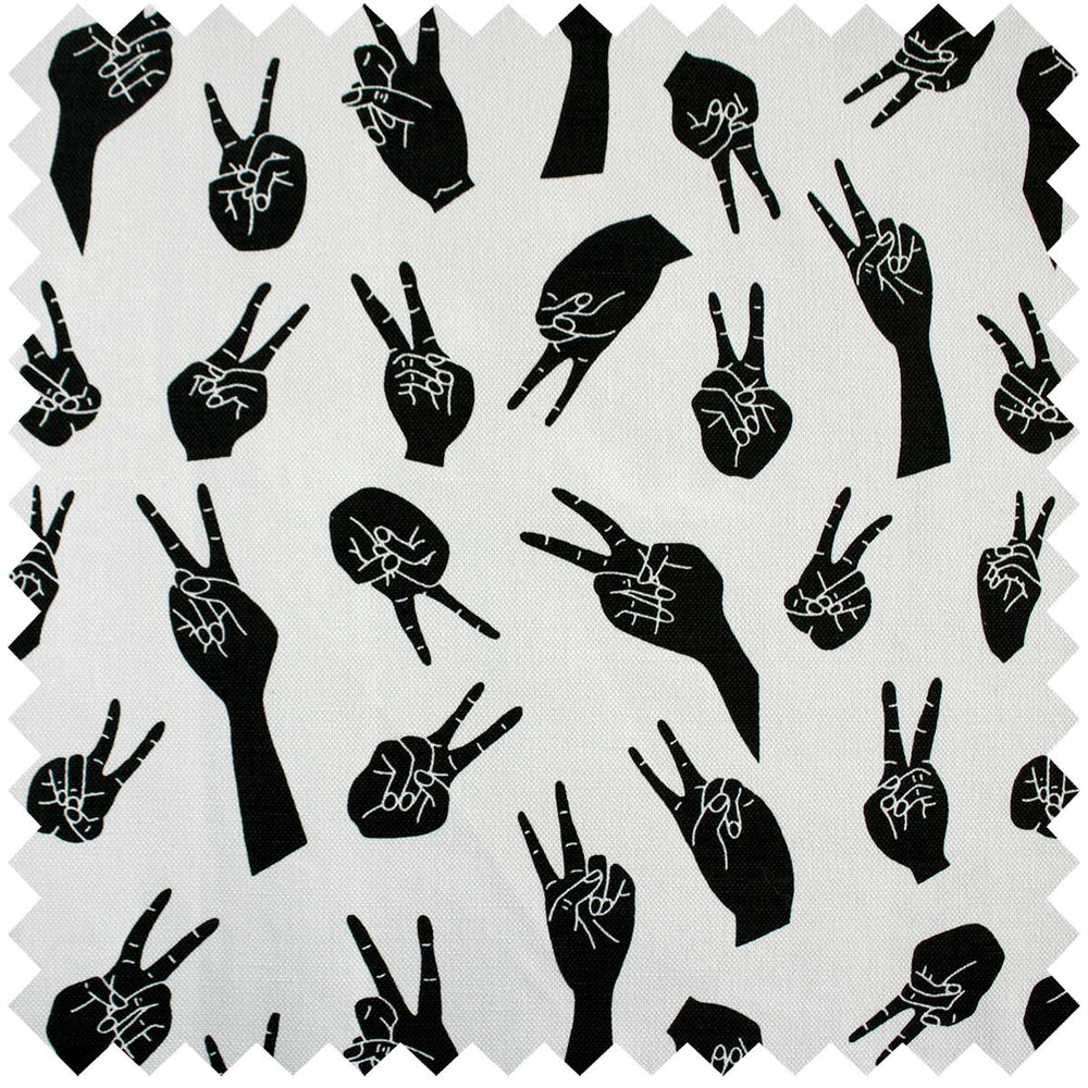 Hand screen printed with all-over pattern of hands making the Peace Sign, the White Peace Hands fabric would make super cool curtains, blinds or upholstery. Screen printed by hand in black onto an off-white cotton linen base, it's a great choice for a fun, unique monochrome fabric.